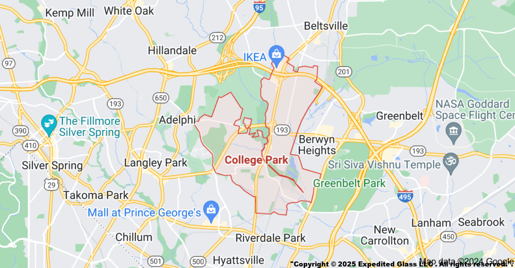 Expedited Glass provides 24/7 Emergency Glass repair services in College Park MD. Our local team will show up in 45 minutes or less after receiving your call. Often we provide same day service for both commercial & residential properties. In addition, we provide emergency board up services if needed.