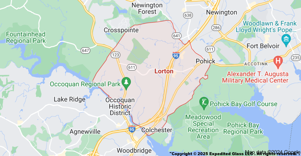 Expedited Glass provides 24/7 Emergency Glass repair services in Lorton VA. Our local team will show up in 45 minutes or less after receiving your call. Often we provide same day service for both commercial & residential properties. In addition, we provide emergency board up services if needed.