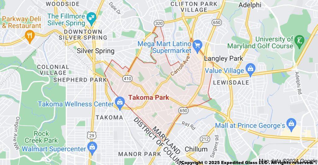 Expedited Glass provides 24/7 Emergency Glass repair services in Takoma Park MD. Our local team will show up in 45 minutes or less after receiving your call. Often we provide same day service for both commercial & residential properties. In addition, we provide emergency board up services if needed.