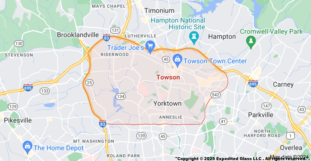 Expedited Glass provides 24/7 Emergency Glass repair services in Towson MD. Our local team will show up in 45 minutes or less after receiving your call. Often we provide same day service for both commercial & residential properties. In addition, we provide emergency board up services if needed.